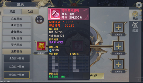 在星辰页,我们打开上方的合成可以看到,左侧是各类词条的星魂,最下方是荒神星魂,而从金色到红色再到粉色品质我们都可以通过低阶颜色星魂去合成,比如红色星魂可以通过三个金色星魂外加星魂神石去合成,来更快获取心仪极品星辰