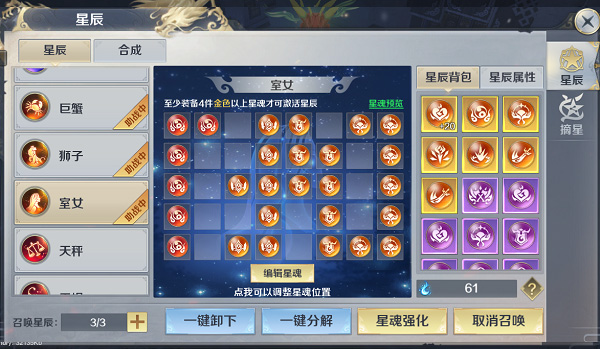 每个星辰可以强化20级,强化需要通过分解其他低级无用的星魂所得的星辰精华;