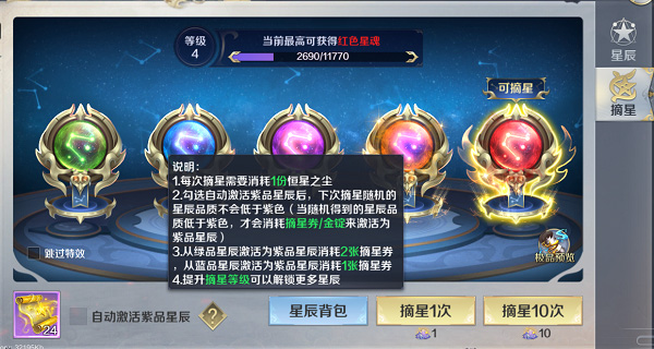 5、同时可以使用左下角提供的星辰保底劵,可以稳定获取紫色以上星辰。摘星卷的获取需要通过商城购买以及活动产出。