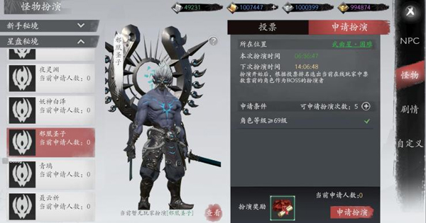 玩家每人每天可以申请和扮演1次秘境BOSS,如果想增加扮演的次数,可以使用BOSS扮演券来增加扮演次数,BOSS扮演劵不需要花钱买噢!可以通过给其他玩家扮演BOSS投票获得,也可以通过分享游戏获得的积分进行兑换。需要注意的是,每个BOSS可扮演的条件是不同的,有的要求角色等级、有的要求活跃度、还有的要求探索秘境的次数。大家在扮演的时候可以根据自己的实际情况来选择想要扮演的BOSS。