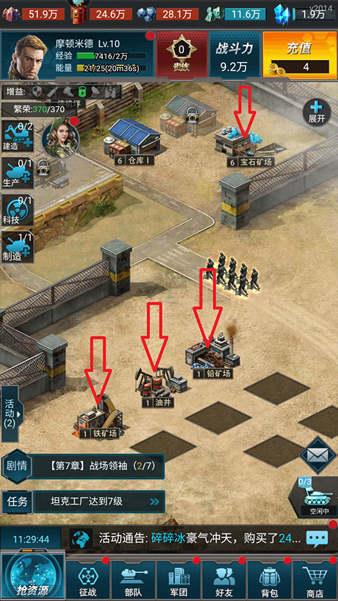 资源是游戏日常消耗和玩家核心争夺的重要点。建筑升级、制造兵种、修理坦克,都离不开资源,这就是场资源的竞争!资源的获取途径可以是矿场生产、矿点占领、玩家掠夺,你会不会也来参与这一场资源的危机引发的战争?