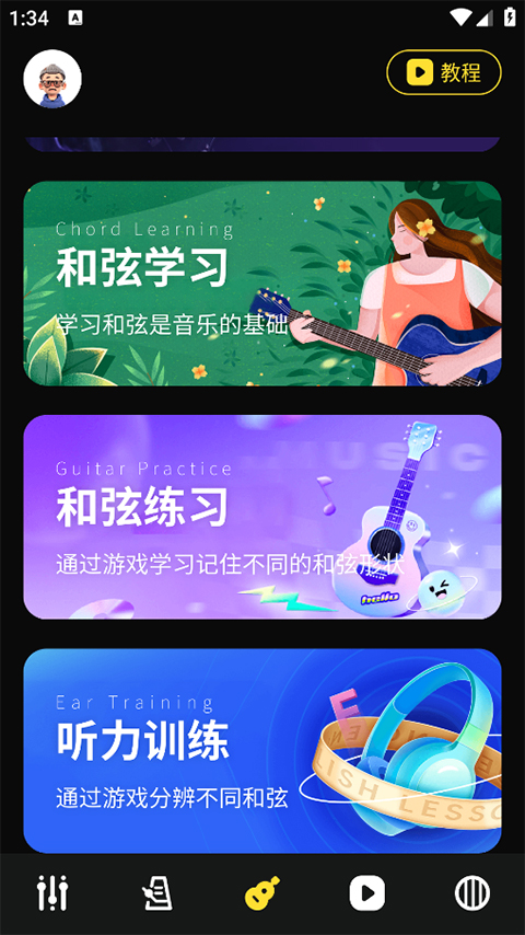 除了基础调音功能,TunerLite还提供了丰富的扩展功能:内置节拍器帮助用户掌握节奏;特有的吉他模拟器让用户在手机上轻松实现弹唱乐趣;专业和弦课程则为用户提供提升和弦技巧的学习资源。