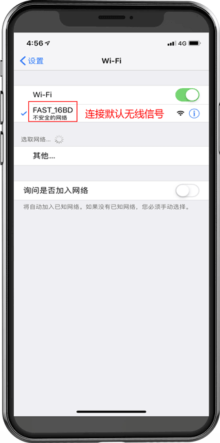打开手机的无线设置,连接路由器默认的无线信号,如下图: