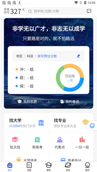 1、打开在本站下载的软件,我们可以看到首页有很多功能,比如志愿填报、找大学、找专业等等