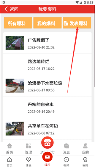 3、在“我要爆料”页面点击“发表爆料”,最后编辑自己爆料的标题及内容发布即可。