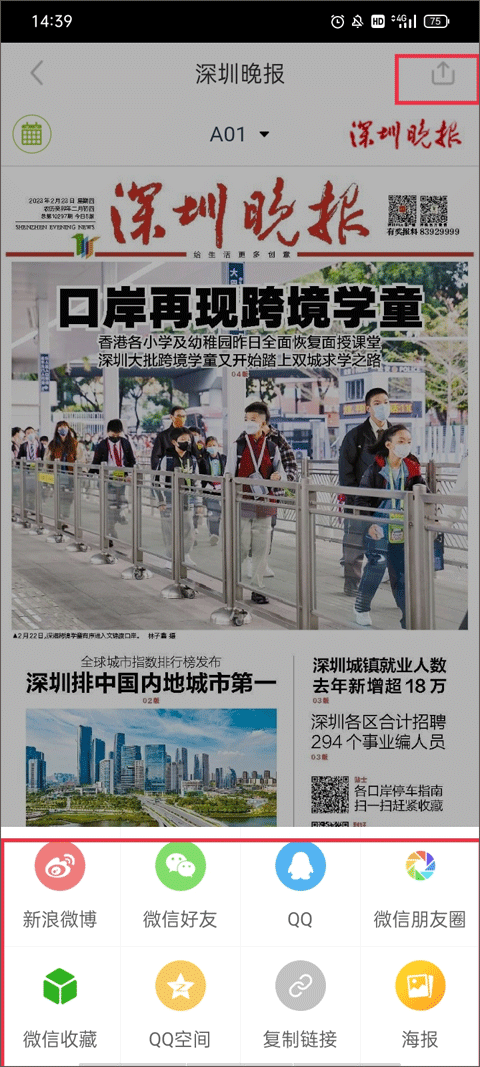 3、点击“深圳晚报”右边的功能键,下方弹出了几个选项,如新浪微博、微信好友、QQ空间、海报等;