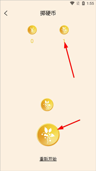 3、打开掷硬币游戏,点击下方硬币可以掷出不同花色,掷出积一分;
