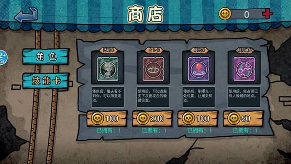 2、点击商店,可以购买各种角色,每个角色都有不同的技能