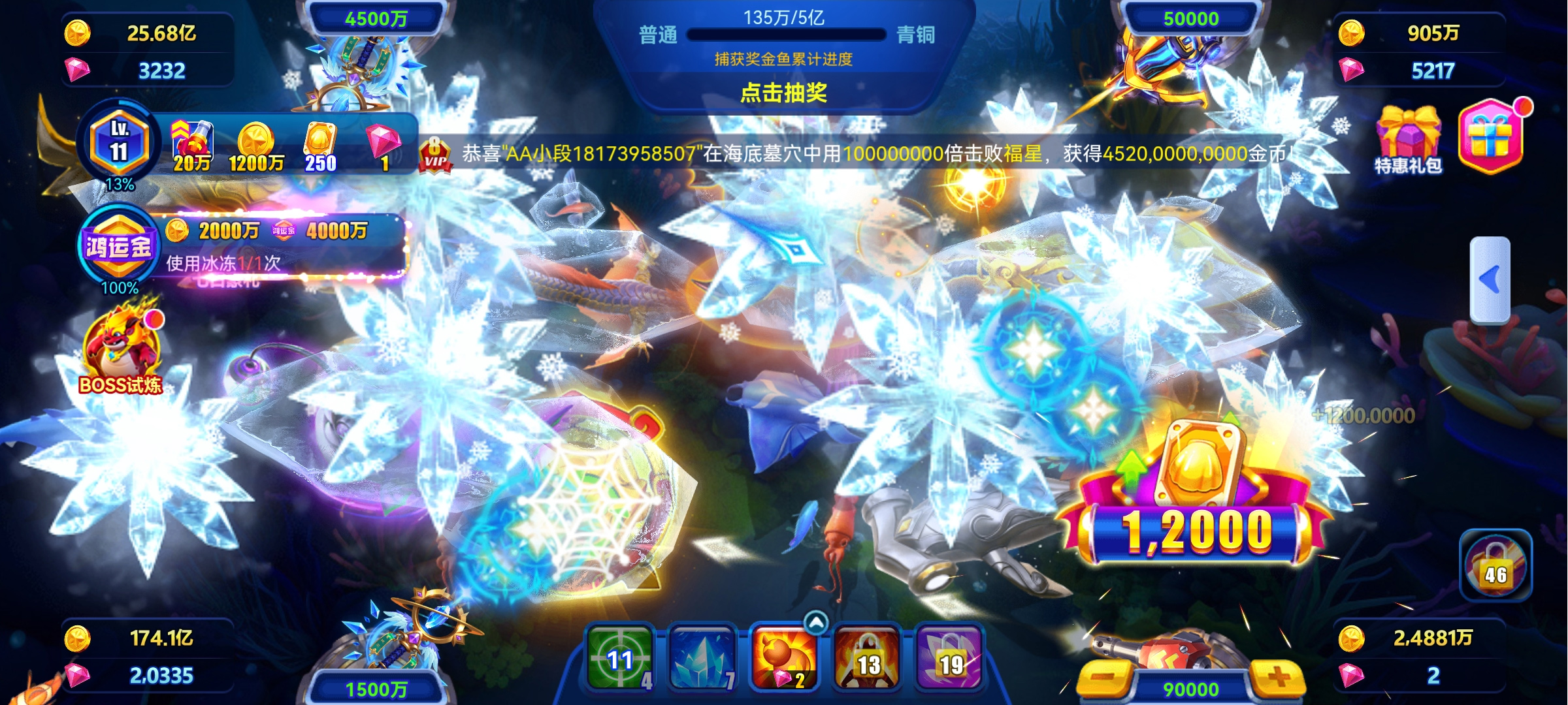 点击渔场下方的【冰】按钮,即可冰冻渔场
