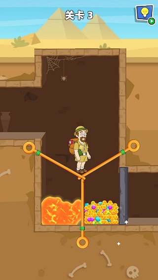 《Pull Him Out》(救救小老弟)是由Lion Studios推出的一款益智手游,玩家在游戏中将扮演一位前往金字塔冒险的考古学家,在陷阱重重的迷宫之中探索,躲避各种危机陷阱,寻找各种宝藏,最终成功逃脱出去。游戏采用了时下流行的别针玩法,以考古探案为背景,融入了故事的剧情,让单调乏味的枯燥玩法,拥有更好的代入感。