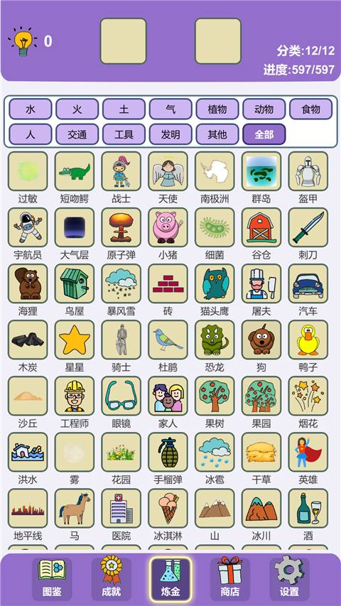 2、逐步解锁更高等级的元素,拓展更多的炼金组合。