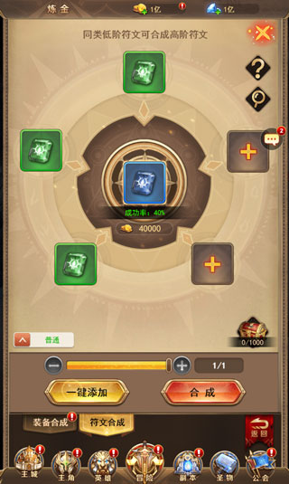 在主城的“炼金”当中,玩家可以消耗金币,将2-5个低阶符文合成一个高阶符文。