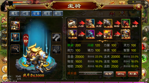 一进入游戏就自动获取一阶坐骑“照夜白”,45级左右完成主线任务可以获得一颗蓝色坐骑进阶丹,使用后可以把坐骑进阶到二阶。高级商人处可以购买到进阶和驯化坐骑的坐骑进阶丹和坐骑驯化丹,也可以用稀有装备在锻造师处兑换。坐骑最高可进阶到八阶坐骑。坐骑驯化可以随机坐骑生命、法术、物攻、法攻、物防、法防六大属性的十二种数值(具体值和百分比两方面),通过坐骑驯化可以获得和自身职业属性完美匹配的坐骑属性。