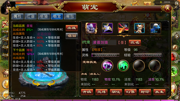 宠物属性的提高分为:升级,灵炼,驯化三个方面,其中驯化又分为驯化宠物自身的技能和驯化宠物给主人的加成。
