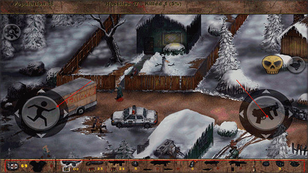 3、右边控制人物移动,左边控制射击,下方是你的武器栏,
