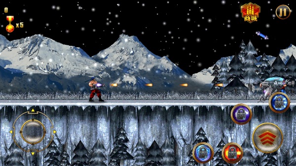 魂斗罗进化革命这关的游戏场景在一片冰天雪地中,这关出现的新兵种--机枪兵(发射子弹的速度奇快),而且这关出现的小兵还会趴下开枪,这无形中增加了游戏的难度,一开始就往前冲,这时雪地里会出现炸弹和机枪兵,在打死机枪兵的同时躲避在身后抛起的炸弹,走到三个断崖的旁边,这时要慢慢走,等后面的三个道具飞过来把最好全部打中,都是有用的,一个“S”,一个“R”,还有一个是“神鹰”,这个时候千万不要向前跳,因为在水里还埋伏着一个向天上放散弹的家伙,等他冒出头时捡“神鹰”干掉他,如果有散弹可以轻松地干掉他;跳过三个断崖后,就是两段平坦的大路了,这两段平坦的路上各有一辆大坦克,解决方法很简单:退到屏幕的最左方转头,对着坦克一直开枪,当把它打红时它就会向我们冲过来,不要跑,一直开枪就可以在它冲过来之前把它搞定,搞定两辆大坦克后,再经过一片有炸弹的雪地就来到了关底。