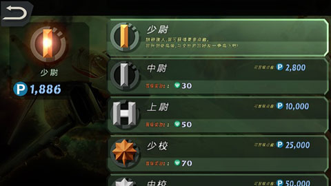 从最低的少尉开始,通过完成任务,获得晋级点数来晋升更高级别的军衔。