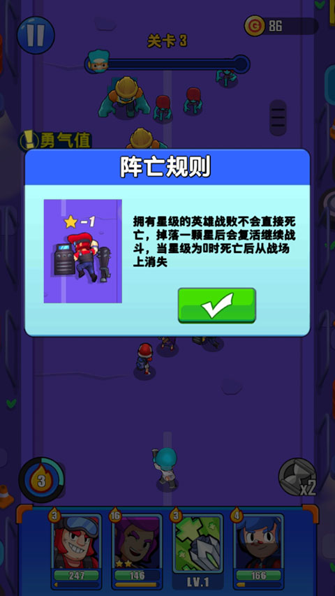 6、关于阵亡规则,拥有星级的英雄战败后不会直接死亡,当星级为0时才会消失;