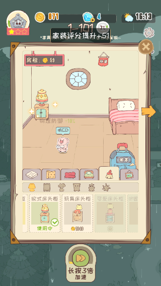 1、如你所见,房间内有着各式各样的加速,玩家可以花费金币进行购买和升级,购买或升级房间中的家具我们就可以收取更高的租金了。