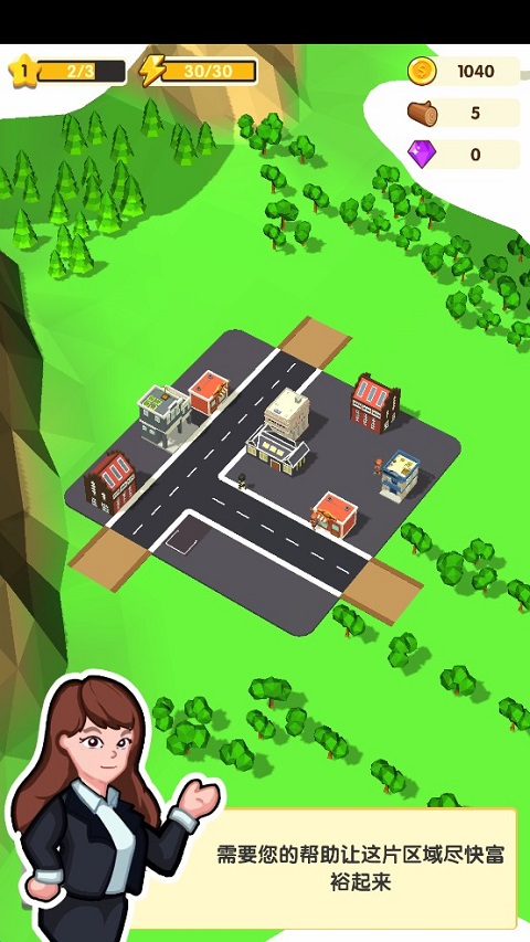 6、城市升星还需用到建筑材料,点击地图上的绿色树木,即可砍伐,砍伐到一定数量,便可将树清理掉,同时也能获得建筑材料。在往后的道路建设中,同样需要依靠这样的操作,清除阻碍。