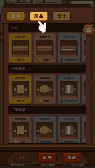 2、通过解锁菜品和改善菜品来吸引更多的客人,解锁新的场景可以迅速提升店铺收益和评分。