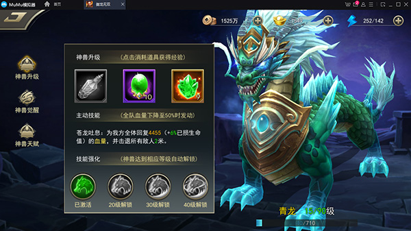 神兽分为青龙、白虎、朱雀、玄武四种神兽,携带后可作为阵容成员之一,前期用的比较多的神兽是青龙和玄武,资源和时间有限,首先培养一种神兽到80级,有充裕的坐骑可以消耗坐骑学习高等级神兽技能,高等级神兽技能在演武场上可以扭转乾坤。