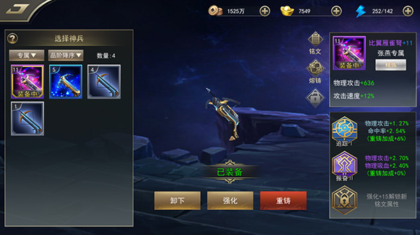 铭文的属性加成有两种方式,一是通过消耗神器进行重铸,二是通过剑丸进行重铸,剑丸可通过福地、每天完成6次辕门挑战宝箱领取、再者就是充值活动。