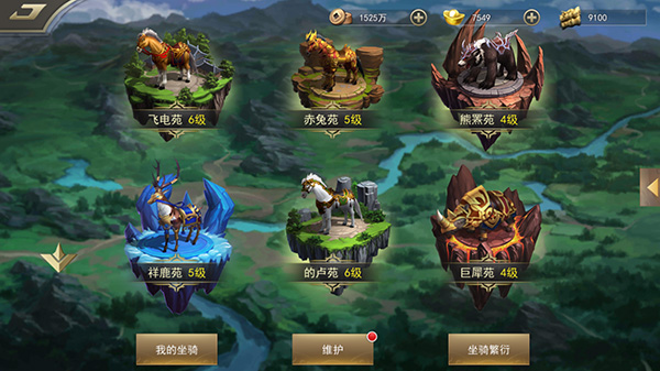 游戏中有9个猎苑,对应9种坐骑,初始仅开放飞电苑,后续可逐步解锁其他坐骑的猎苑。