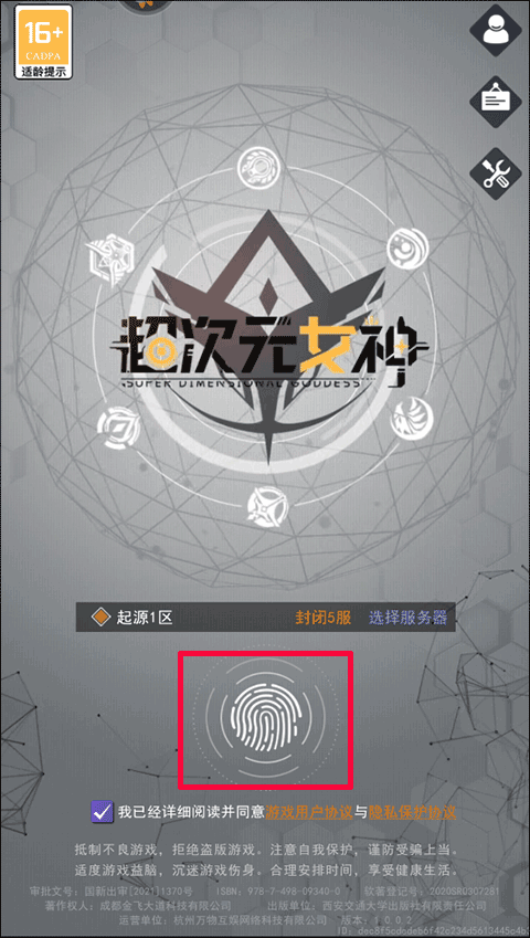 1、运行游戏后,在标题界面点亮“我已详细阅读并同意游戏用户协议和隐私保护协议”后找到并按住红色方框内的指纹区域进入游戏;