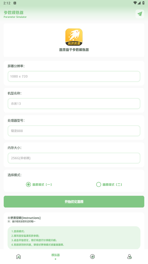 2、这里还可以输入你手机的分辨率、机型、内存等信息来优化画质,进行更高清画质的模拟。