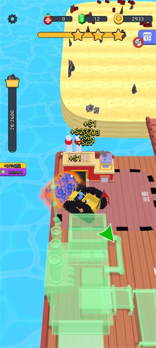 玩家需要操控挖掘机将岛屿上的矿石全部碾碎带到工厂里售卖每种颜色不同的石头代表着不同的坚硬度
