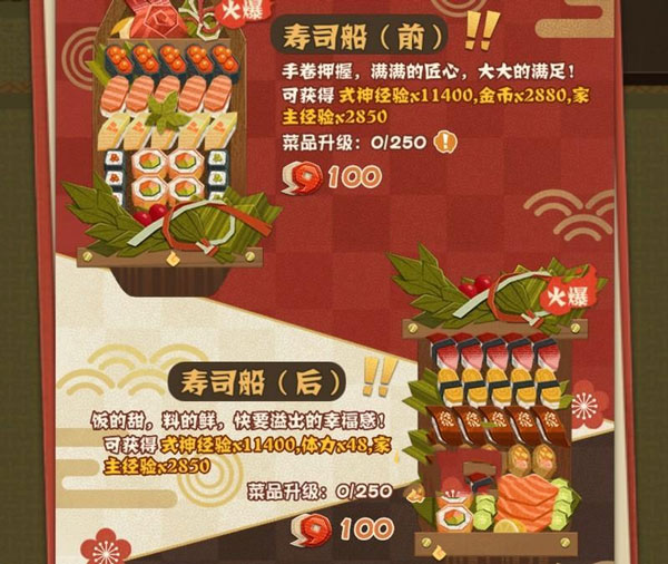 制作各种不同种类的菜肴料理,然后在家中开一个聚会,每天可以开3次,冷却时间4小时。还能邀请或者被邀请的好友的2个式神过来蹭饭吃。蹭饭同样是每天3次,但没有CD时间。建议0氪玩家选择10个不同名食物攒勾玉。其他玩家选10寿司+8一星来吃经验。