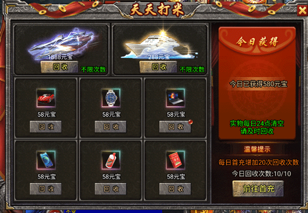 三、前期优先提升角色等级,进入对应高级打宝地图。获得高级装备后会自动穿戴,也可合成更高配置装备,别忘了经常清理回收背包装备,可以获得大量金币。