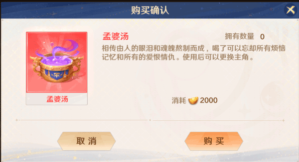 2、这个时候玩家只需要使用孟婆汤就可以重新选择主角职业,重新切换一次。孟婆汤一般可以在商店里用2000元宝获得,并且每14日可购买一次,所以玩家要珍惜选角色职业的机会哦。