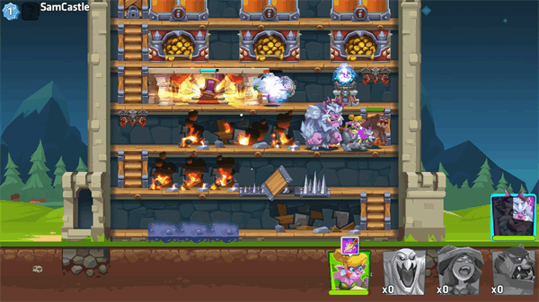 游戏采用创新的垂直塔防玩法,你需要在每个回合中选择一个位置放置塔防设施(如炮塔、火墙等)来攻击怪物的弱点,并合理安排防御位置保护自己的城堡。当怪物靠近时,你还可以使用各种魔法技能来击败它们。