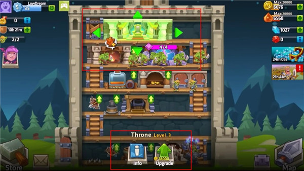 在游戏中,你需要用创新的垂直塔防玩法来保卫你的城堡,在每个回合中,你需要选择一个位置放置塔防设施,例如炮塔、火墙等,来攻击怪物的弱点。同时还需要合理安排防御位置,保护你的城堡。当怪物靠近城堡时,你需要用各种魔法技能来打败它们。