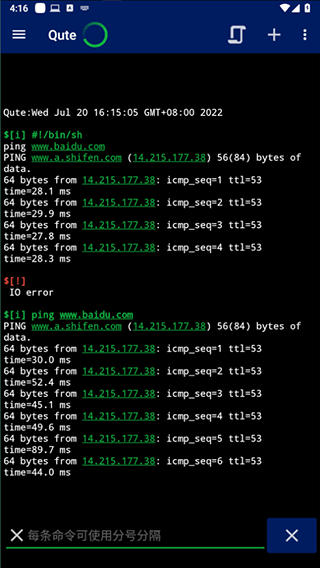 Qute命令行shell是一款可以在安卓设备上面执行shell命令和终端模拟器的app,用户可以使用它在安卓设备上快速访问内置Linux命令行shell,可以执行最流行的PC命令(ping,netstat,微量,CD,mkdir等常见的终端命令),用手机运行命令,支持linux系统的命令都可以在手机上进行模拟。