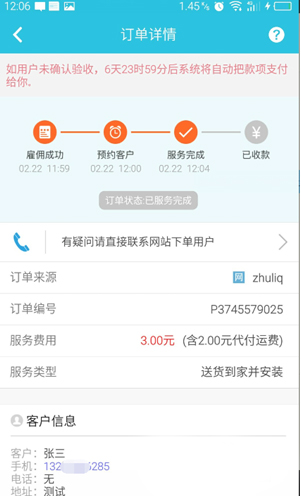 服务完成后,会有打款倒计时。若用户确认验收,款项马上到师傅钱包。若用户没有确认验收,7天后服务费用自动打到师傅钱包。