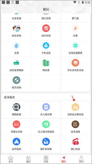 1、打开app并进入【首页】,切换到【便民】页面,点击政务服务的“身份证办理查询”。