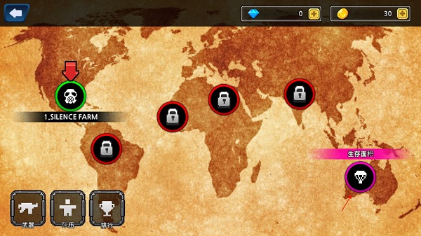 除了主线的关卡模式,游戏内还有其他模式,如生存模式,在当前模式下玩家要尽可能通过杀敌来保障自己的生存时间,期间你会得到各种材料,用于解锁和升级武器。