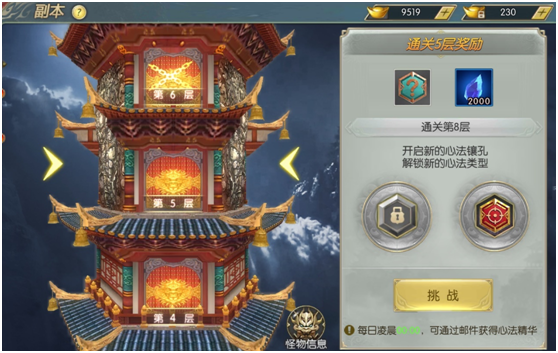 通过相应层数的锁妖塔,解锁双属性心法合成功能