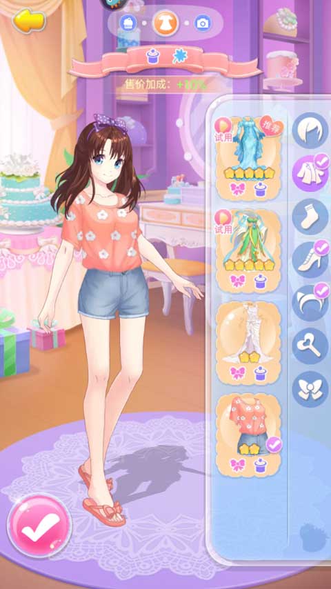 玩家需要点击小店门口旁边的那个类似镜子的图标并点击它。选择好蛋糕的类型之后,开始装扮自己的服装。最后选择一个你喜欢的杂志板式即可。