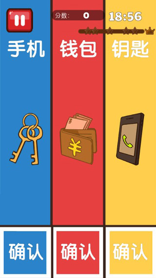 第十关出门有三宝游戏玩法:点击确认所显示的钱包、手机、钥匙与所对应的文字是一致的
