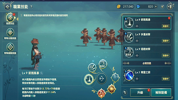 知己知彼百战百胜,首先我们要了解作为主角大概会有怎样的技能组成体系,职业技能主要是由“职业技能”、“特殊主动技能”、“特殊被动技能”三个版块组成,“职业技能”包含了三个固定技能和一个必杀技,但是在刚开始玩家只能使用前三个,因为必杀技是需要玩家等级到达20级的时候才能解锁的。