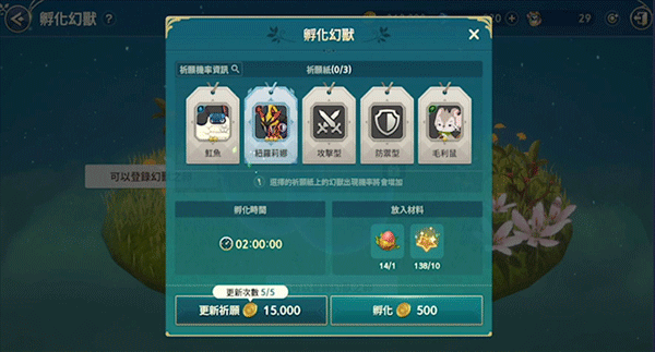 无氪玩家的话就还需要孵化来获得幻兽,这个是需要消耗祈愿值的,并且同时能进行孵化的位置也有限,需要提升等级逐步的解锁。幻兽其实在地图上还有一个获取的方式,很多不喜欢开自动跑图的玩家应该会优先发现,那就是幻影蝴蝶,透过捕捉它可以获取一些幻兽,喂食之后就可以驯服,至于是什么星级就要看运气了。