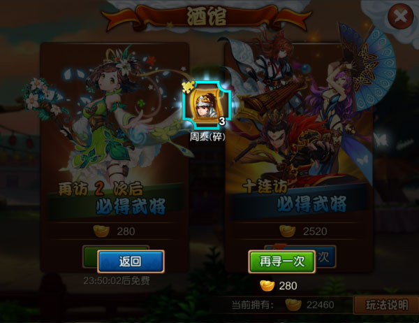 这里呢,建议大家可以先去做一些任务,升升级,顺便攒一些元宝。前期元宝产出还是很多的,当攒到2520元宝时,就可以去进行十连抽。不要问为什么不去单抽,非洲人并不想说话。一般来说,首次酒馆十连抽基本上都是张飞。十连抽建议再抽两次,一般为黄忠,司马懿,周瑜,曹冲,不管是抽到三个人物,都不要再抽了,这些武将足够进行游戏了。抽到已拥有的武将时,武将会自动转换为相应武将的信物哟~