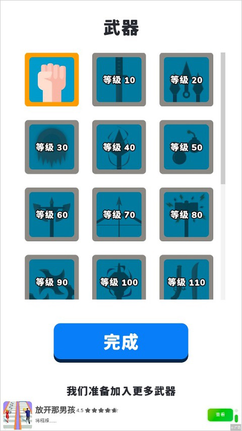 武器的解锁方式并不是用金币,而是通过关卡。