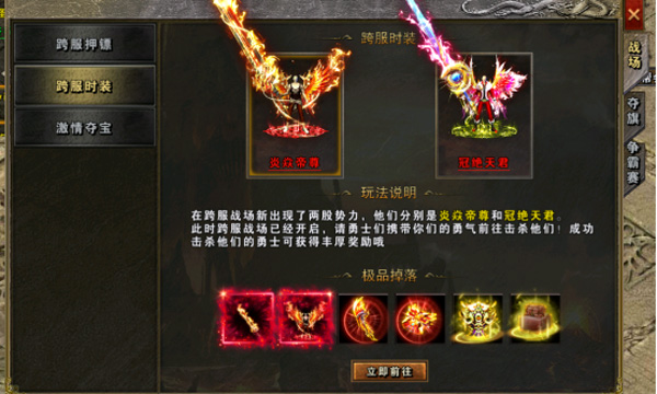 跨服时装活动玩法介绍:活动分为炎焱帝尊和冠绝天君两个BOSS,可进入跨服战场后玩家可以在BOSS刷新后击杀他们可以获得丰厚奖励。