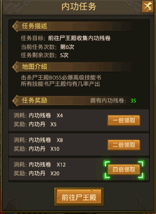 1、玩家可在内功任务NPC处进入内功任务,一天有5次次数;