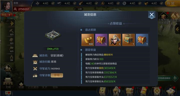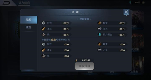 三、势力—资源功能内,领取宝库和城池奖励(城池奖励需要势力占领城池才可领取)